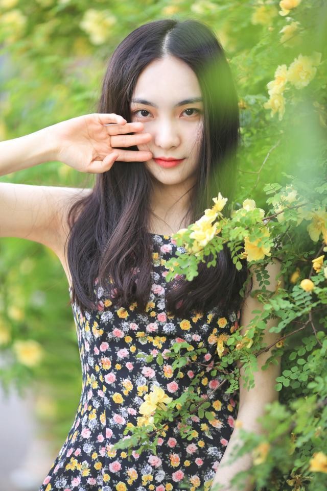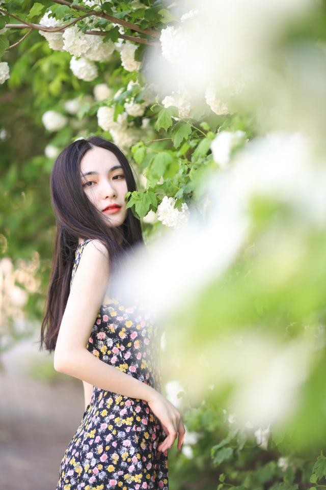 可以利用花儿来摆动作,手持花儿贴近五官,营造一幅闻花香回头看的画面,就像抓拍一样,很自然,这里有点小心机哦,脸大的女生可以用头发遮一下更完美。