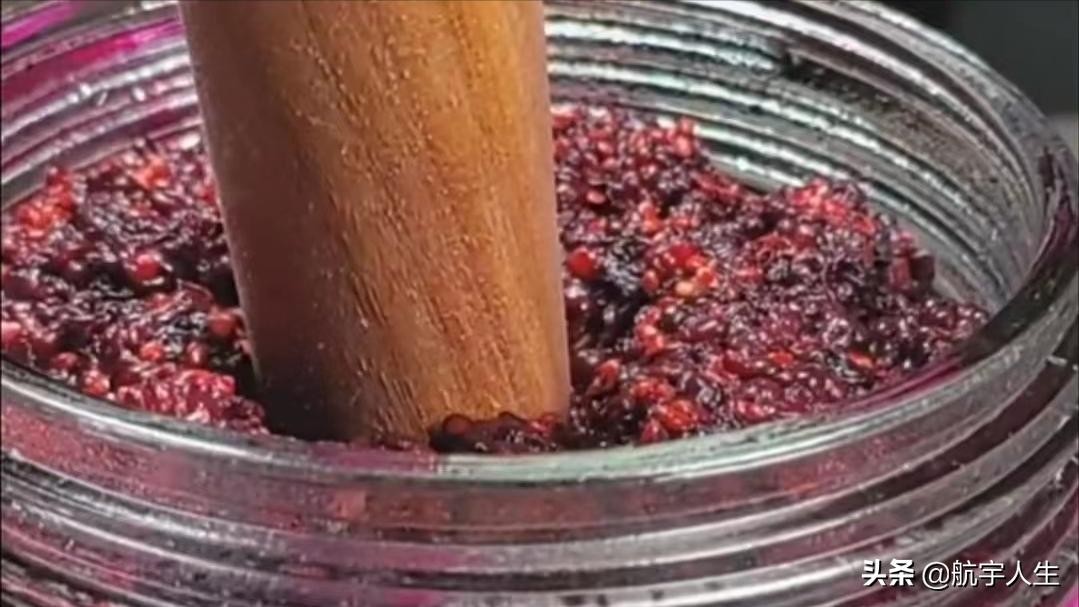 2、用擀面杖把桑葚捣成果泥,做果酒就是用桑葚本身的果汁、果糖,不需要蒸馏,不需要糖化处理,一定要密封好,剩下的也捏碎,用勺子舀到玻璃瓶里面;
