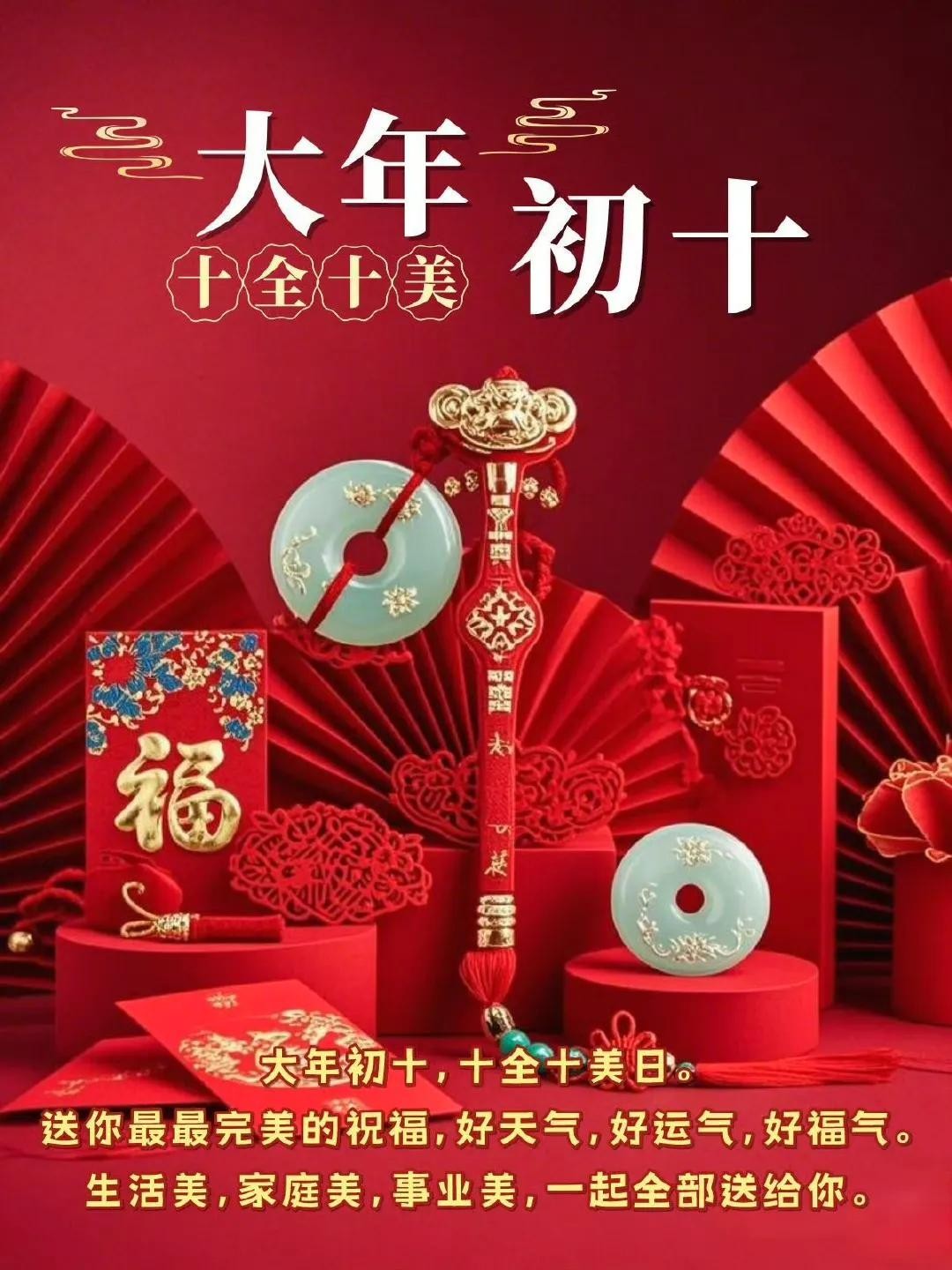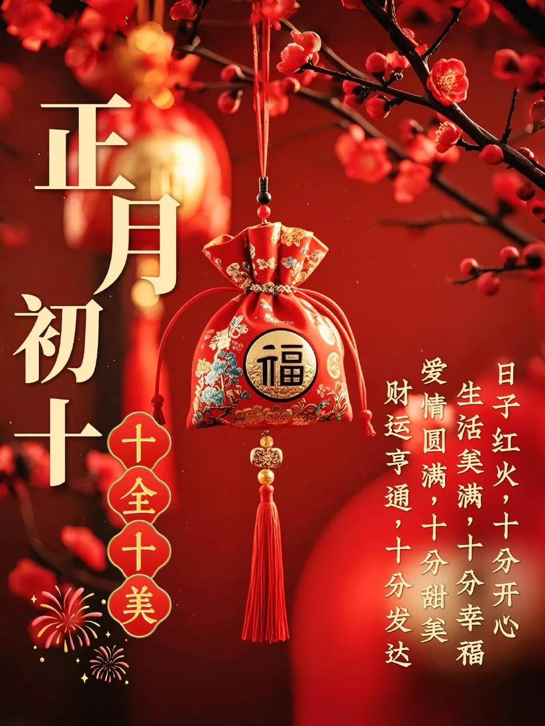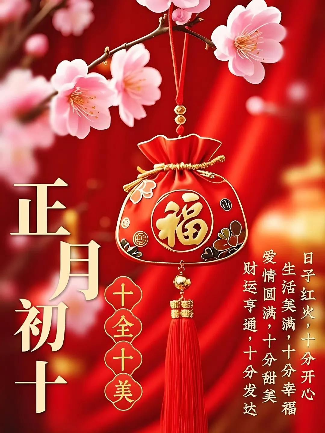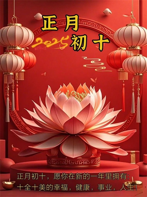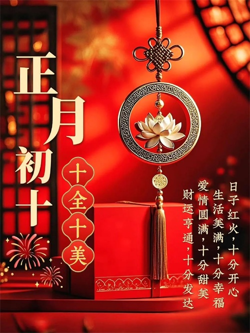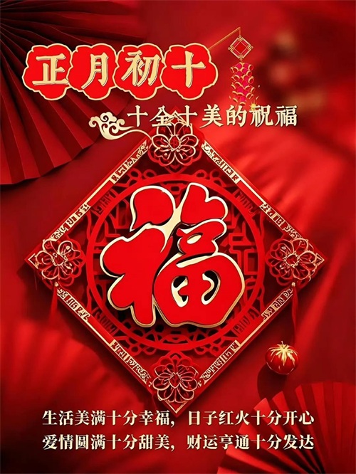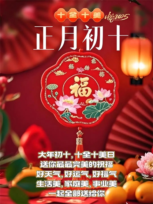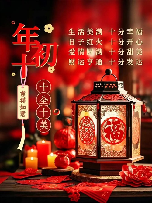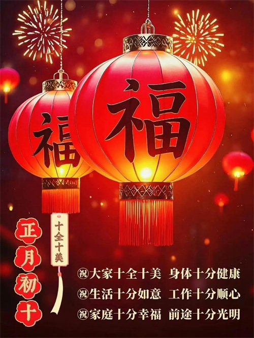 初十鞭炮震云霄,福禄寿喜齐报到。身体硬朗精神爽,吃嘛嘛香胃口好。心想事成有盼头,美梦成真不迟到。天天都有好心情,岁岁安康无病扰!
