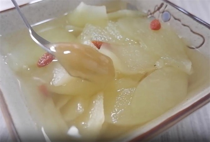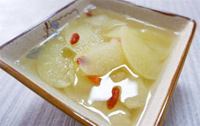 3.苹果煮软之后,加入适量的冰糖和枸杞,等到冰糖完全化开,就可以盛出了。