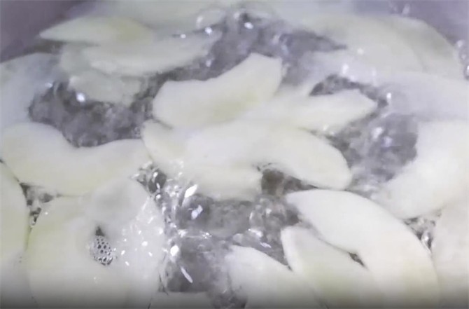 2.接着把切好的苹果倒入锅中,然后再加入三碗水,加好水之后,中火把苹果煮一下,一般煮15到20分钟。