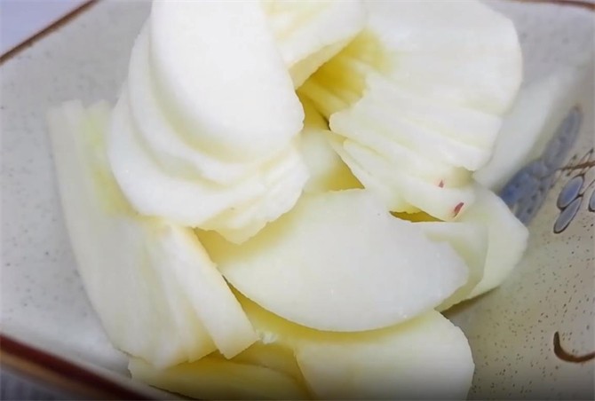 1.取一个苹果先去皮,去皮之后,我们再把它切成稍薄一点的块状。