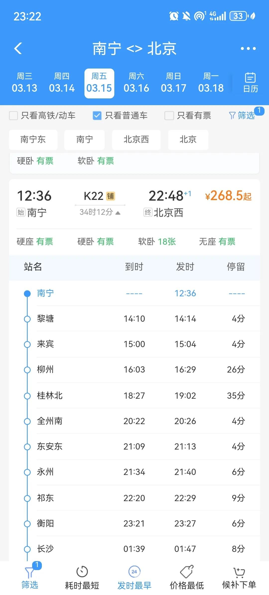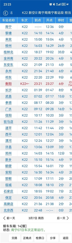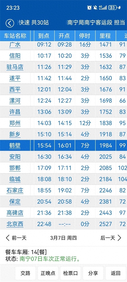 列车从南宁始发,停靠来宾,柳州,桂林北。来宾拥有“中国观赏石之城”,柳州是焦柳铁路的终点之前,后来延长至南宁,同时柳州境内的“壮歌、瑶舞、苗节、侗楼”堪称“四绝”。柳州是广西最大的工业城市,形成了以汽车、机械、钢铁为龙头,多产业并存、工业门类齐全的产业体系,18.27抵达桂林北,桂林是世界著名风景游览城市,桂林山水甲天下,尤其是象鼻山,23.21.抵达衡阳,第二天凌晨抵达湖南长沙,然后中间一站不停,于早上7点抵达湖北武昌,依次孝感,广水,然后进入河南境内,在河南境内几乎站站停,毕竟白天客流稳定,诸如,信阳,漯河,许昌,郑州,新乡,安阳等站,信阳虽然是北方城市,却是南方气候,漯河是有名的食品城,产生了国民小吃辣条,卫龙辣条。许昌更不用说了,一个胖东来,一个假发之都,郑州,河南省会,列车跨越黄河母亲河,抵达新乡,站台依旧没有改造,安阳,殷墟遗址,也是汉字博物馆所在地,然后进入河北地界,
