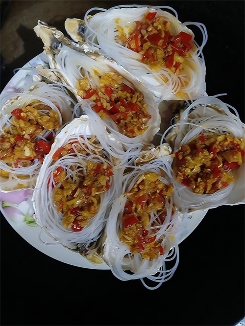 蒜蓉蒸生蚝出锅后,撒上一些葱花和胡椒粉,为其增色添香。然后将蒸好的生蚝盛入盘中,保持生蚝的鲜嫩和蒜蓉的香味。