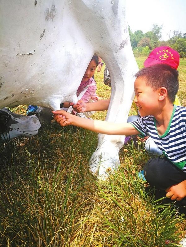 在厂区文化园区,小记者们还争相和形象逼真的花白奶牛塑像合影,并模拟体验了挤牛奶的乐趣。