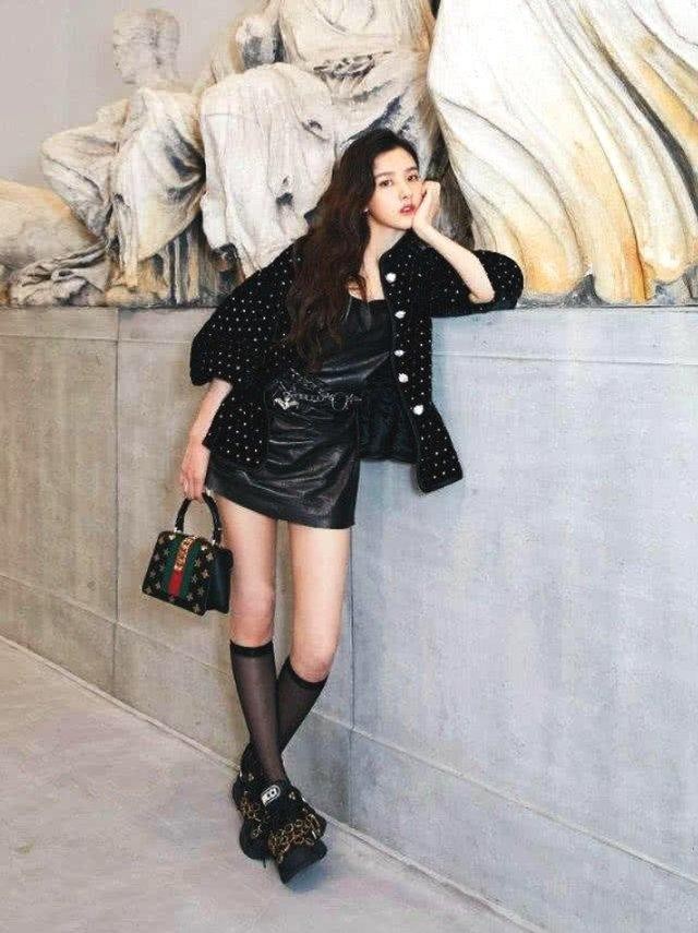 是不是看着很不搭呢?上半身带有波点元素的夹克单品,内搭一条性感但是略带成熟意味的皮质连衣裙,虽然衬得她皮肤更加白皙,但是好似与她整体造型的风味有些不搭,略显轻熟了~ 更何况她还另类地穿搭一双球鞋!