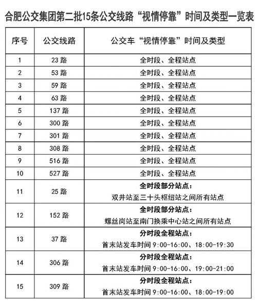 合肥公交集团第二批15条公交线路“视情停靠”时间及类型一览表