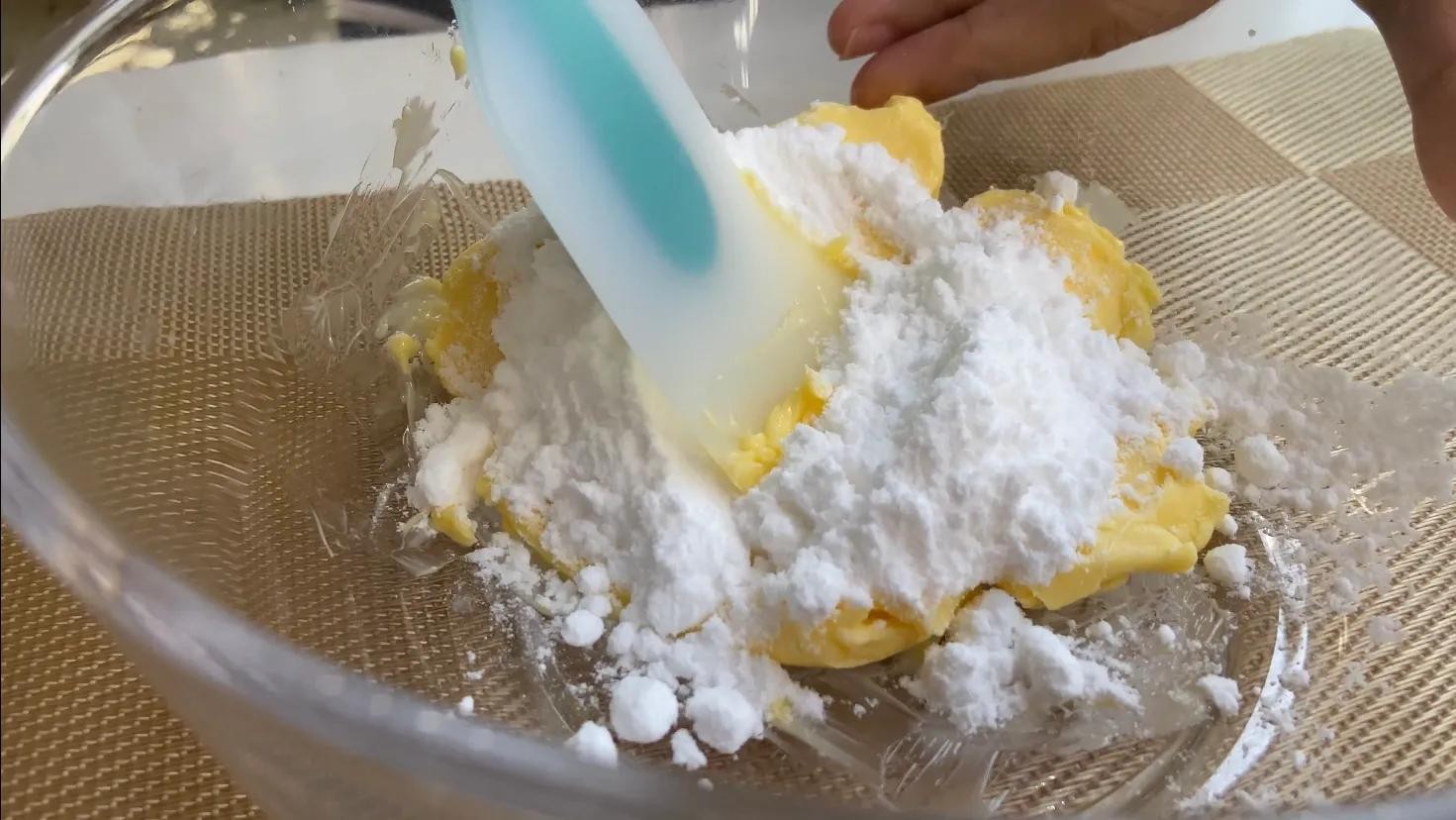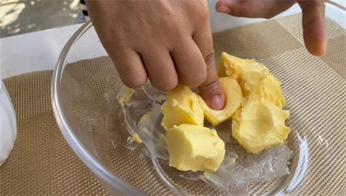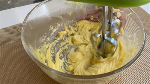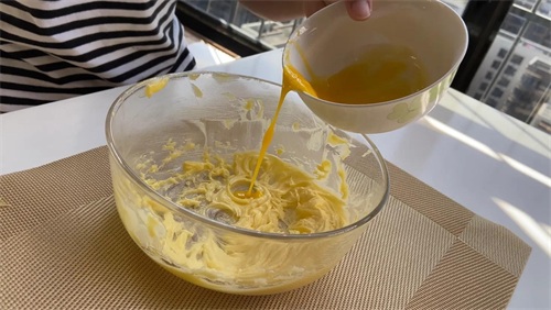 黄油中分3次加入搅散的蛋黄。不要一次性把蛋黄加入黄油里,避免水油分离。只要把蛋黄融入黄油里就可以了,不用搅拌太久。