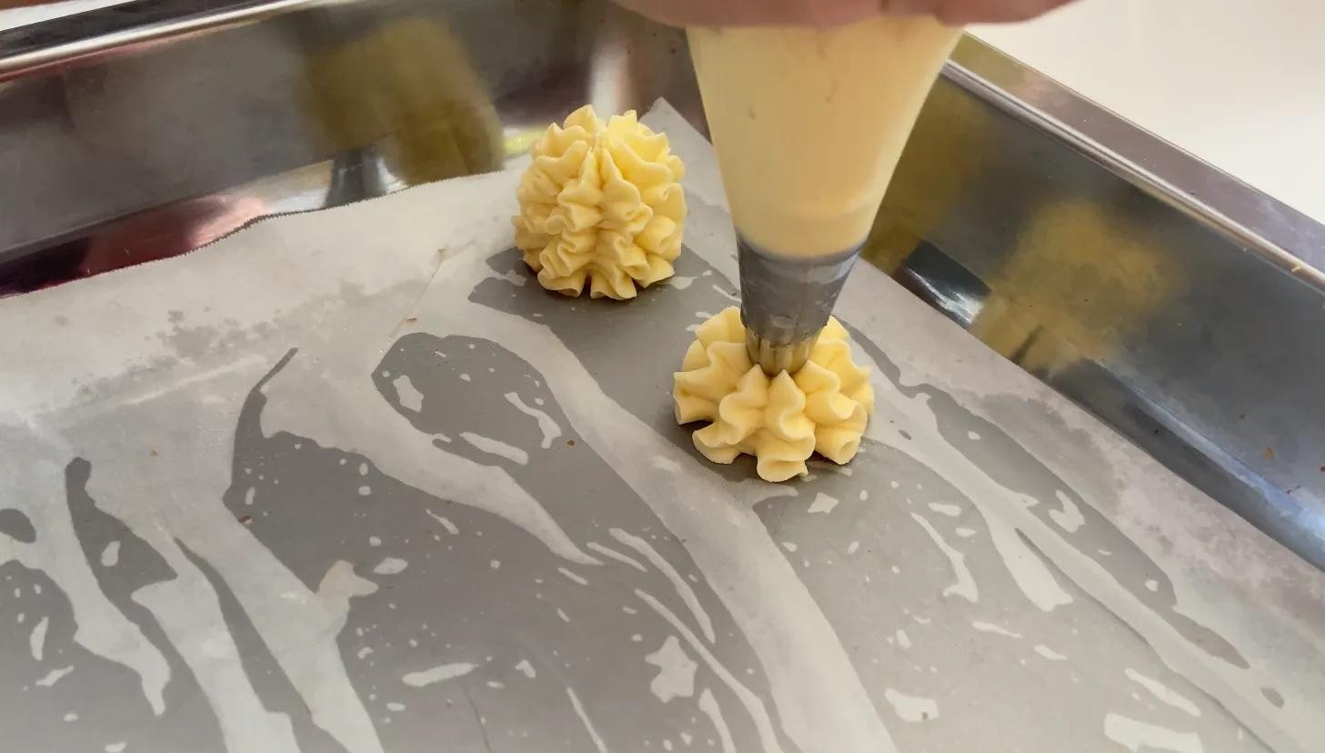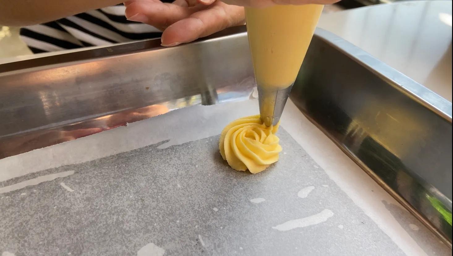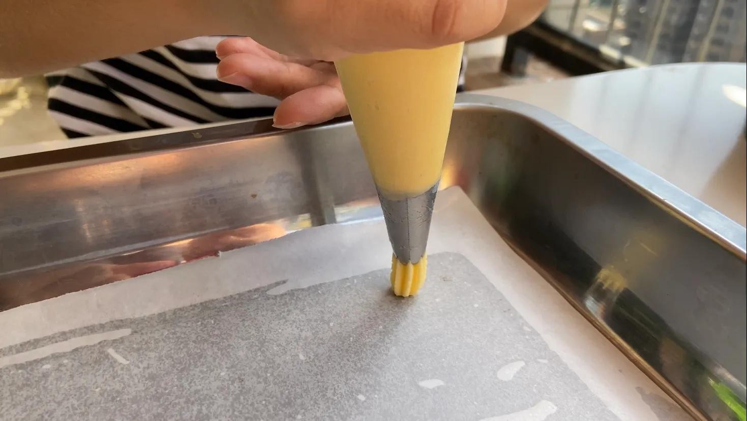 先把面糊挤出2厘米,在烘焙油纸上点中心,然后一边挤面糊一边绕着中心点转一圈即可。