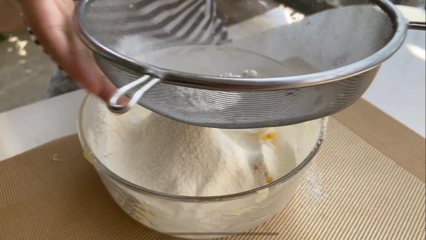 筛入低筋面粉70克,避免面粉有颗粒。用二字搅拌或者切拌的手法搅拌,不要画圈搅拌,避免面粉起筋,面粉起筋的话做出来的曲奇饼干就没那么酥脆。不过也有些人喜欢没那么酥脆的曲奇,就可以用高筋面粉。