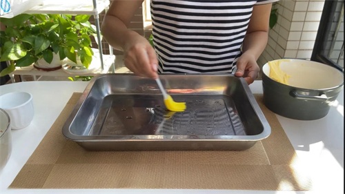 烤盘上刷上一层薄薄的油,放上烘焙油纸,刷油是为了吸住油纸,这样裱花时候烘焙油纸才不会轻易移动。