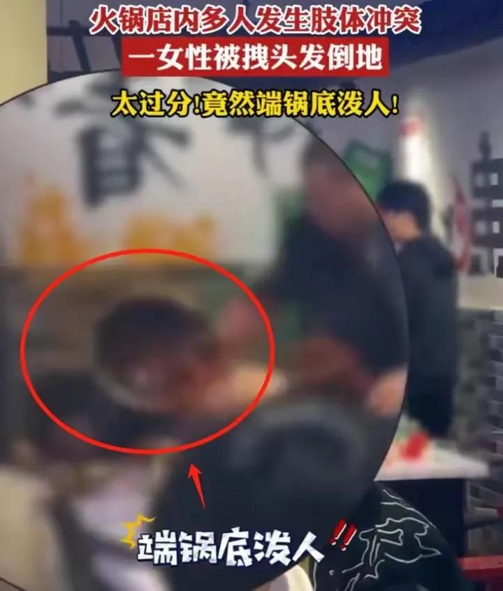 视频中可以看到,两名中年男子端起火锅锅底,直接泼向地面上的年轻男女,导致两人瞬间发出惨叫。这一幕让围观的人群胆战心惊。