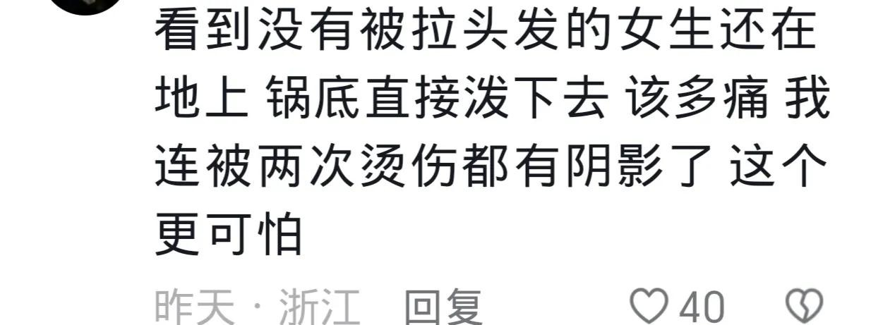 看到没有被拉投的的女生还在地上,锅底直接泼下去,该多痛,我连续被两次烫伤都有阴影了,这个更可怕。