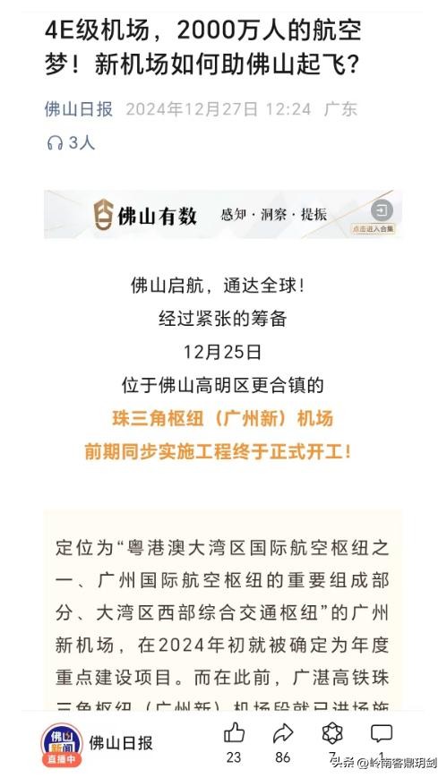 唯一查到消息是,12月27日12点,佛山日报公众号提到高明国际机场前期工程25日已经开工建设。令人感到奇怪的是,这么大的项目,官方没有官宣和举行开工典礼的消息?