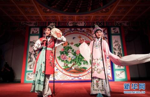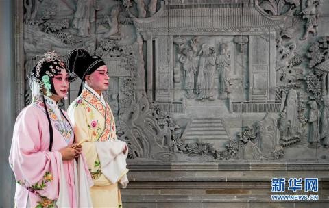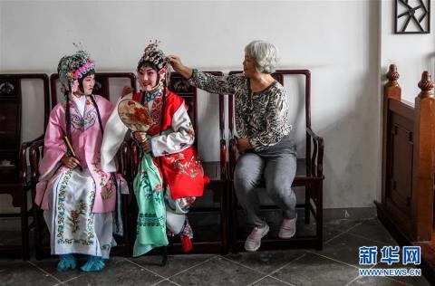 4月26日,两位昆曲演员在古戏台准备表演昆曲折子戏《惊梦》。江苏省昆山市千灯镇是有2500多年历史的古镇,也是中国古老戏曲剧种昆曲的发源地。千灯镇人学昆曲、唱昆曲,蔚然成风。 新华社记者 杨磊摄