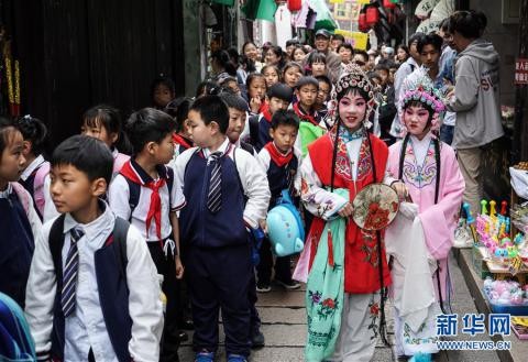 4月26日,身着昆曲演出服的小昆班学生吸引了前来古镇春游的小学生。江苏省昆山市千灯镇是有2500多年历史的古镇,也是中国古老戏曲剧种昆曲的发源地。千灯镇人学昆曲、唱昆曲,蔚然成风。 新华社记者 杨磊摄
