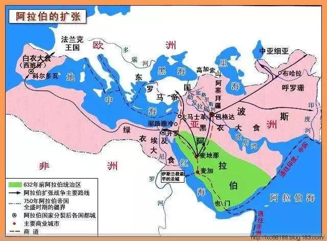 8世纪初,倭马亚王朝的政权巩固以后,阿拉伯人开始发动大规模的对外战争。在东线、阿拉伯军队攻入中亚,占领喀布尔、布哈拉、撒马尔罕和花拉子模等广大地区,直至帕米尔高原,与中国唐朝相对峙。另一支东线军队向南攻入南亚次大陆的北端,占领印度信德一带。在北线,倭马亚王朝曾3次发兵,围攻拜占廷首都君士坦丁堡。西线的进攻最为猛烈,不仅占领从突尼斯、阿尔及利亚直到摩洛哥的马格里布地区,还以新皈依伊斯兰教的北非土著柏柏尔人为主力,于711年跨过直布罗陀海峡,攻入西欧的伊比利亚半岛。消灭西哥特王国后,阿拉伯人翻越比利牛斯山脉,攻入西欧法兰克王国。732年,阿拉伯人在普瓦提埃战役中失利,停止向西欧内陆的进攻。不过,他们在意大利和法国的地中海沿岸仍频频得手。到了8世纪中叶的倭马亚王朝后期,阿拉伯帝国的版图西临大西洋,东至印度河,成为地跨亚、非、欧三大洲的庞大军事帝国。