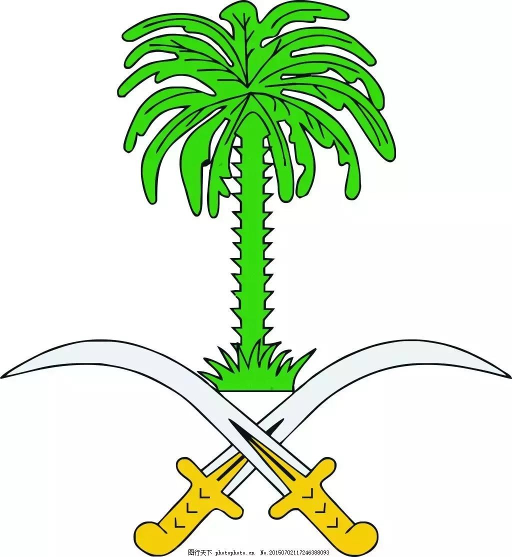 呈绿色。由两把交叉着的宝刀和一颗枣椰树组成。绿色是伊斯兰国家的喜爱的颜色。宝刀象征圣战和武力,象征捍卫宗教信仰和保卫祖国的决心和意志;枣椰树代表农业,象征沙漠中的绿洲。另外,沙特人民最喜爱枣椰树,并把它作为捍卫宗教信念的象征。