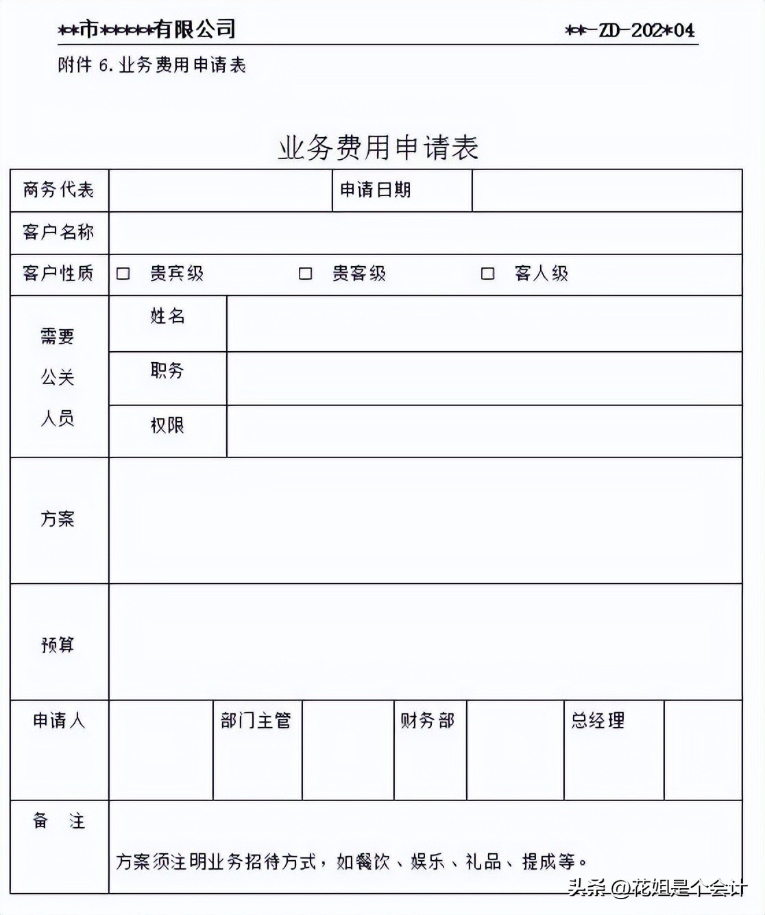 2.报销时必须提供已经审批的《业务费用申请表》( 200元以内除外),报部门负责人备案即可,财务人员核对报销内容是否与《业务费用申请表》内容一致,如果是赠送礼品,需要提供《礼品清单》。