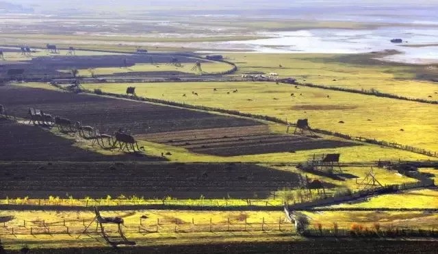 每当秋风渐起,纳帕海草原湖水就会开始下降,露出一片片金黄的高山草甸,形成独特的高原沼泽美景。