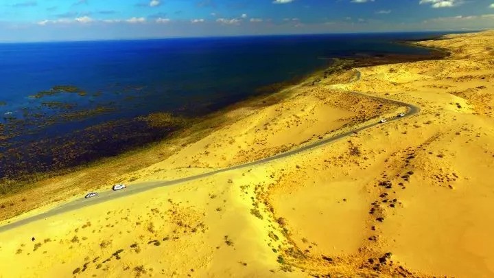 金黄的沙漠,清澈的湖水,碧蓝的天空,蜿蜒迂回的沙漠公路......构成了一幅风光旖旎、风景迷人的天然画卷,让人心旷神怡。
