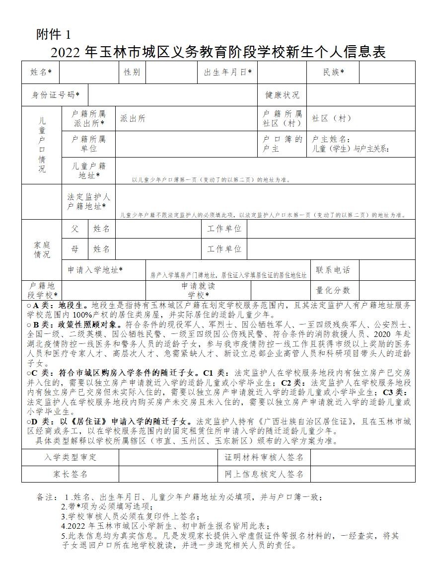 网上填报成功后,小学、初中(A类、B类、C类、D类)新生家长自行打印《玉林市城区义务教育阶段学校新生个人信息表》(附件2)。根据疫情防控要求,学校安排分批错峰到校,仅限一名新生家长和新生,携带上信息表及相关材料于7月30日至7月31日玉林市育才中学进行原件验证,审核材料和已填报的信息,审核材料负责人在材料复印件上验核签名。查验原件并存档复印件。如为现场报名的,学校审核材料的负责人对报名材料审核签名后,同时把适龄儿童报名的信息录入新生入学系统。