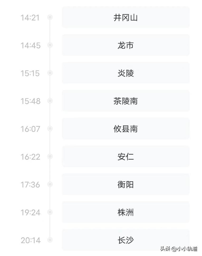K2369次列车是井冈山站-长沙站的一趟快速旅客列车,本次列车14:21从井冈山出发,20:14到达长沙。中间一共停靠7站(详情见图),全程405公里,运行时长5小时53分钟。列车由广州局长沙段担当,25G型客车。