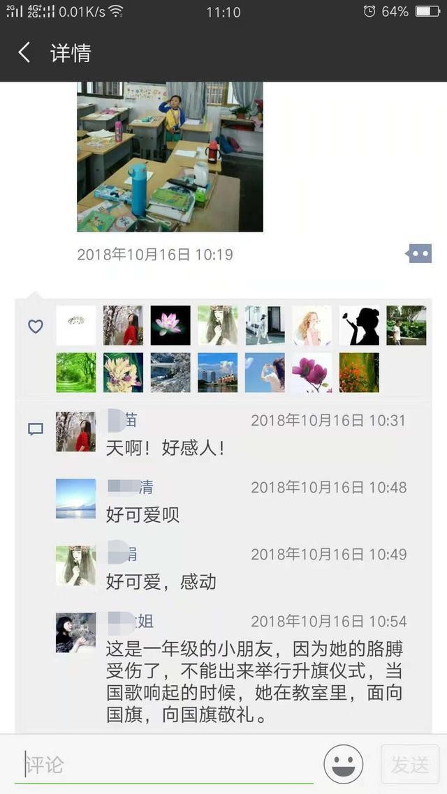 “这张照片是上个月15号,学校举行升旗仪式时,一位放广播的老师无意间捕捉到的。当时李钰冉的手受伤了,还在修养期,而每周一学校都要举行升旗仪式和国旗下演讲,老师害怕其他的同学不小心碰到她,所以就安排她在教室里休息。”蒋校长说,让老师们没有想到的是,在国歌响起的时候,李钰冉独自一人端正地站在教室里,面向国旗方向,抬起右手向国旗敬礼。