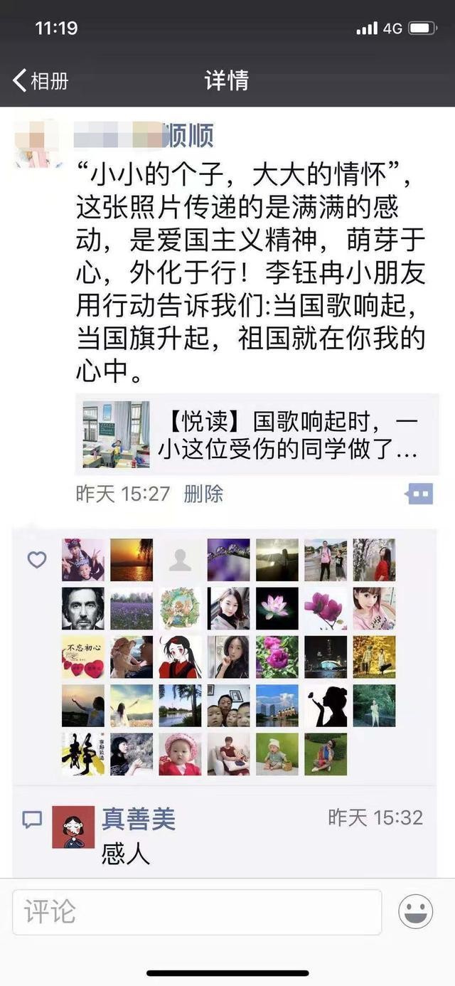 有老师表示:“小小的个子,大大的情怀,这张照片传递的是满满的感动,是爱国主义精神,萌芽于心,外化于行!李钰冉小朋友用行动告诉我们,当国歌响起,当国旗升起,祖国就在你我的心中。”