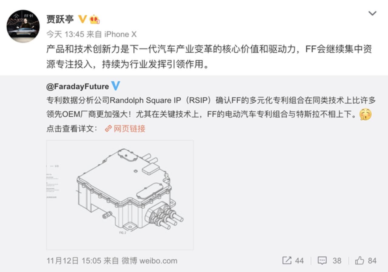 11月13日,一直把回国挂在嘴边的贾跃亭在微头条转发了条新闻——“专利数据分析公司Randolph Square IP(RSIP)确认FF的多元化专利组合在同类技术上比许多领先OEM厂商更加强大!尤其在关键技术上,FF的电动汽车专利组合与特斯拉不相上下。”
