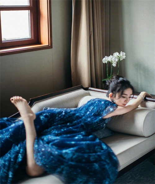 杨幂星空拖尾裙造型魅惑,斜躺秀迷人侧颜天鹅颈,光脚不失俏皮感