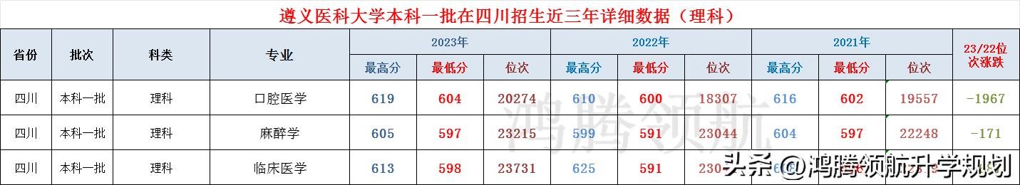 遵义医科大学在四川本科一二批次均有招生,在本一批次招收3个专业,“临床医学、口腔医学、麻醉学”,招生人数分别为28人、15人、13人,共计招生56人,这是外省医学院校中较大的在川招生规模,2023年录取分数为597,排名23215位次,较2022年下滑171位次,录取分数并不算高。