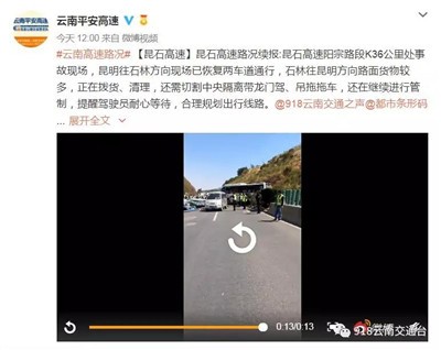 12点00分,@云南平安高速发布昆石高速路况续报:昆石高速阳宗路段K36公里处事故现场,昆明往石林方向现场已恢复两车道通行,石林往昆明方向路面货物较多,正在拨货、清理,还需切割中央隔离带龙门驾、吊拖拖车,还在继续进行管制,提醒驾驶员耐心等待,合理规划出行线路。