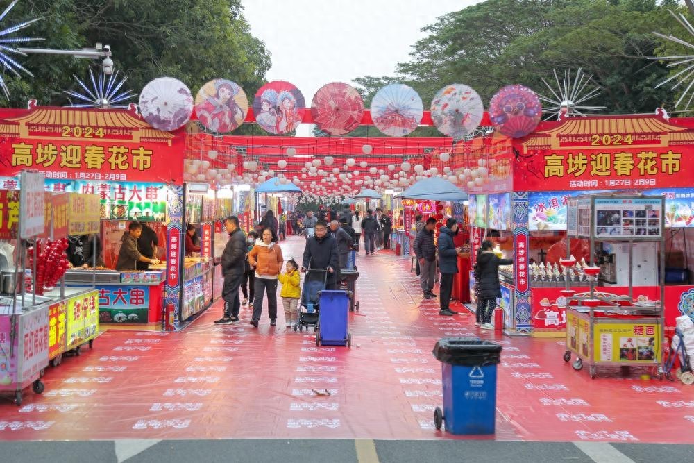 俗语说“行花街,转大运”,1月27日,2024年东莞高埗迎春花市正式开市。本届花市位于高埗广场东边停车场及周边,花市总面积约8000平方米,设有年花年桔区、年货区、美食区、游乐区等共约100个摊位。市民不仅可以在现场买到款式多样的年花和年桔,还能赏花灯、玩游戏,“遛娃”和行花街两不误。