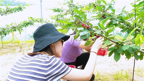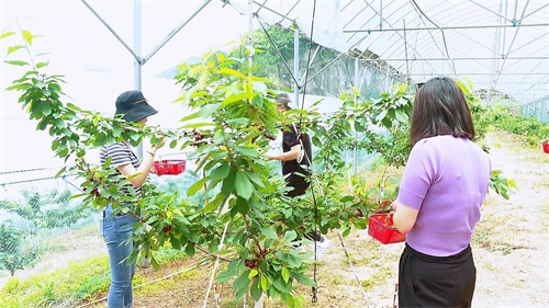 在天目山镇周云村海拔500多米的潘家山,山顶上的一个个农业设施大棚就是车厘子种植基地。走进种植大棚。只见一颗颗红色、黄色的车厘子挂满了枝头,在阳光的照耀下,晶莹剔透。在设施大棚里,几名游客正在采摘车厘子。“因为我们这边都没有车厘子,只有樱桃 ,樱桃口感就没有这个好,看到这边也有车厘子摘,就很兴奋。”