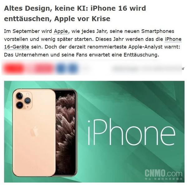 【手机中国新闻】iPhone 15 系列上市不到半年,iPhone 16 系列的消息已经在网上大面积传开。不仅如此,许多媒体对 iPhone 16 系列提前给出了悲观的预测。据手机中国了解,有德媒发文指出," 得益于 " 老旧的设计和缺失的 AI,iPhone 16 会令人失望,苹果面临危机。