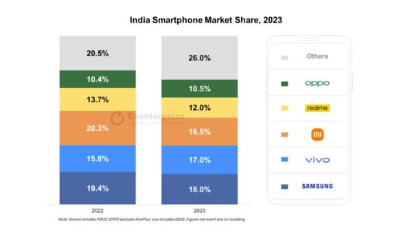 2023印度最畅销手机品牌 三星第一 vivo小米分列二三