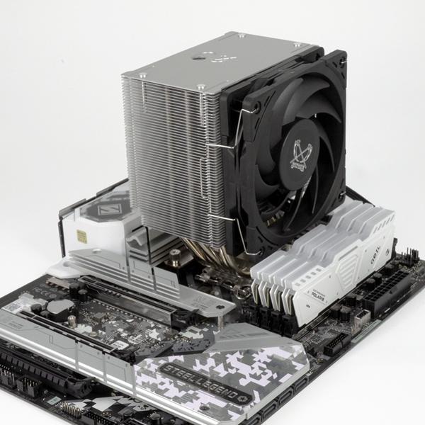 MUGEN 6 散热器本体仅高 154.5mm,采用镜面铜底 + 6 根 6mm 热管的组合,搭配向后向上偏移设计,可提升对高马甲内存和主板散热装甲的兼容性。其搭载的新款狂风丸 Wonder Tornado 120 风扇,最高转速可达 2000rpm,最大风量 60.29CFM,最大风压 2.54mmH2O。