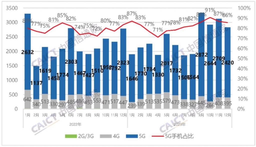 而在这些出货的手机中,5G 手机已经占到了绝对的份额比例。比如根据中国信通院的数据,2023 年 12 月,5G 手机出货量 2420.0 万部,同比增长 4.2%,占同期总出货量的 85.6%。而 2023 年全年,5G 手机出货量达到 2.40 亿部,同比增长 11.9%,占同期总出货量的 82.8%。