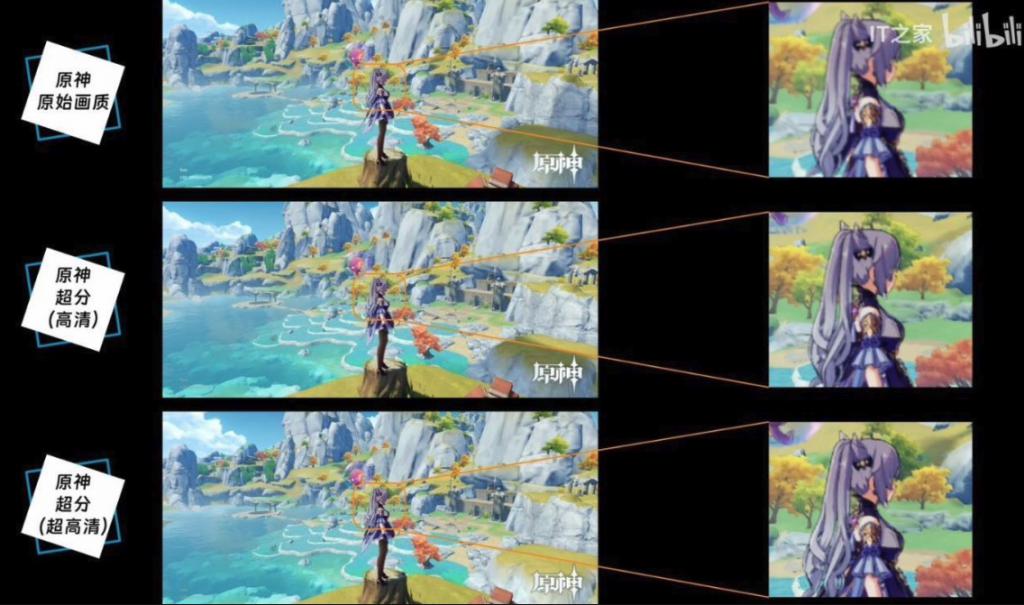具体来说,iQOO 12 Pro 的游戏超分有原始画质、高画质和超高画质三个功能选项。以《原神》为例,在游戏中风景秀丽的渌华池,使用游戏自带的拍照功能,分别在不同的超分选项下拍摄一张画面,对比三张照片,首先肉眼可见清晰度方面的差异,不超分时,刻晴的头饰、肩饰都是模糊的,而当超分调整为超高画质时,角色、饰品的纹理已经清晰可见。