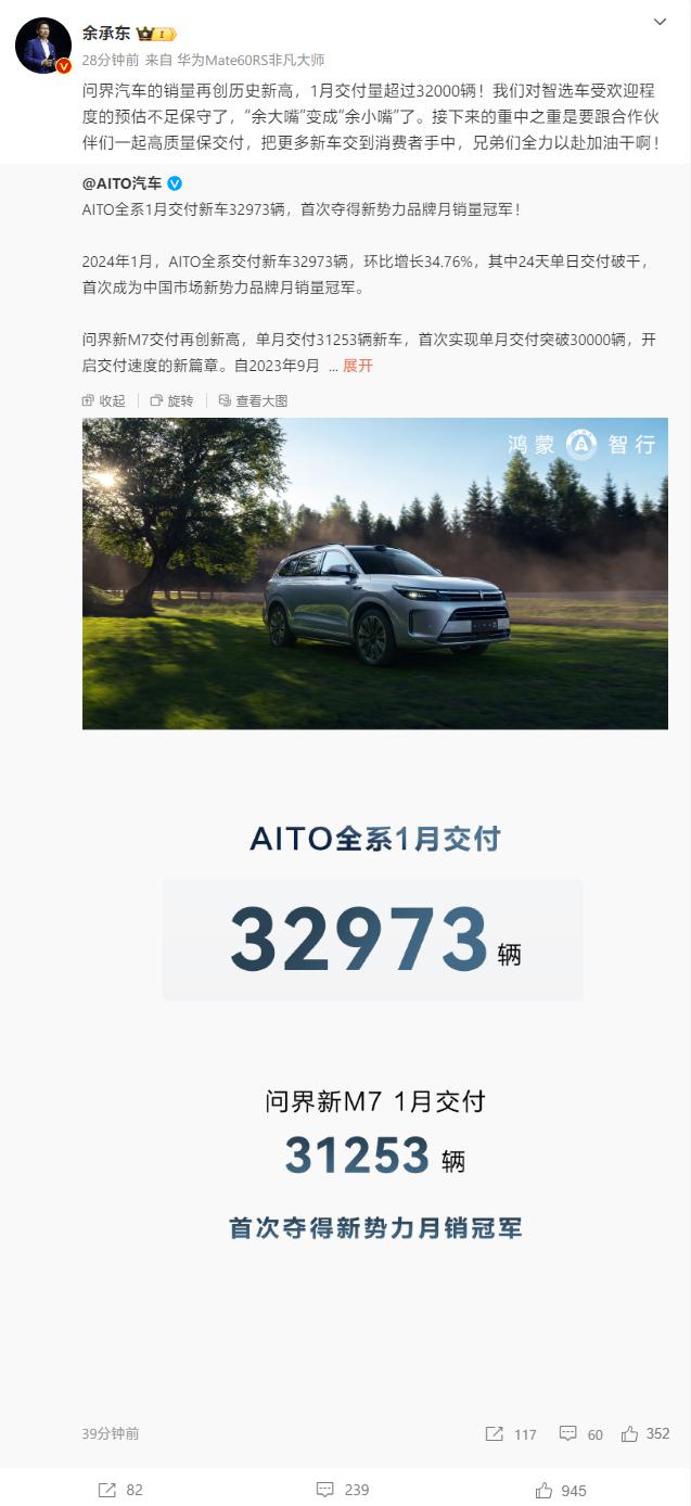 IT 之家 2 月 1 日消息,今天下午早些时候,问界汽车公布了 1 月的 " 成绩单 ":交付新车 32973 辆,首夺新势力品牌月销冠军,详情可见 IT 之家此前报道。