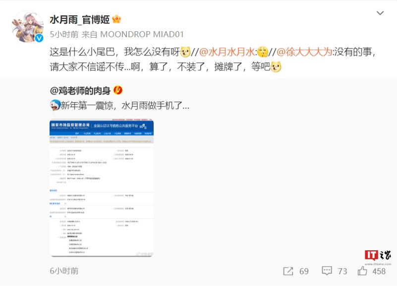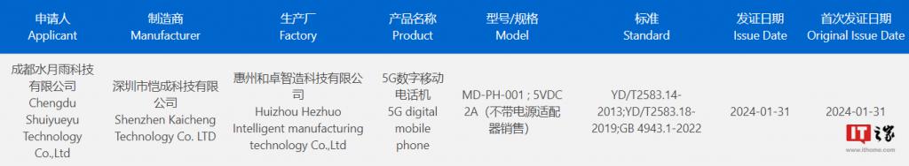 IT 之家 2 月 1 日消息,耳机品牌 " 水月雨 MOONDROP" 要造手机了,成都水月雨科技有限公司的一款 5G 新机 1 月 31 日获得 3C 认证,支持 5V 2A 的 10W 充电。