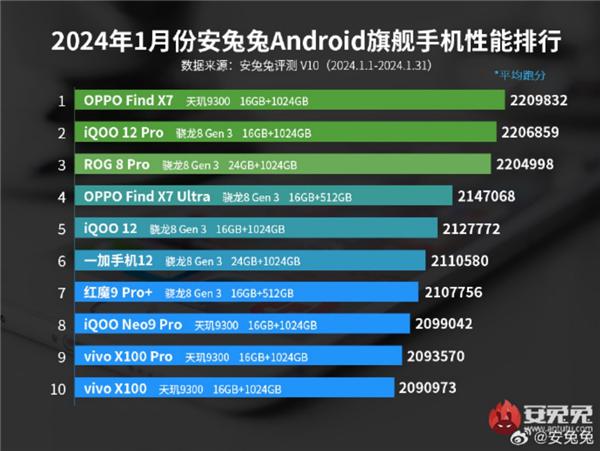 安兔兔1月性能榜出炉:天玑9300旗舰性能榜荣登第一、天玑8300次旗舰一骑绝尘