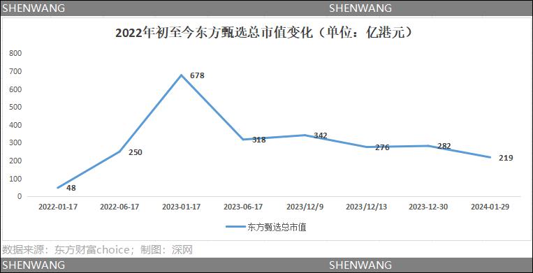 过去一年,东方甄选的总市值跌去约 2/3。2023 年 1 月 17 日,东方甄选总市值为 678 亿元,2024 年 1 月 30 日,东方甄选总市值降为 220 亿,一年跌去了 400 多亿市值。