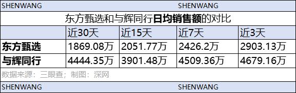 据三眼查数据显示,近一个月来,虽然东方甄选的日均销售额不及与辉同行,但也正在逐步回升。近三天,东方甄选直播间的日均销售额为 2903 万,与辉同行为 4679 万。