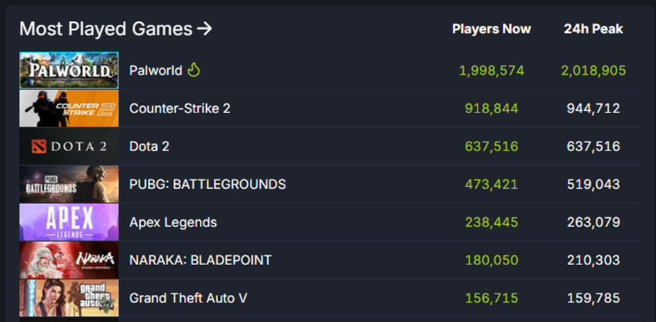 1 月 24 日,《幻兽帕鲁》在 Steam 上 24 小时内峰值在线人数为 2018905 人,居于榜首。