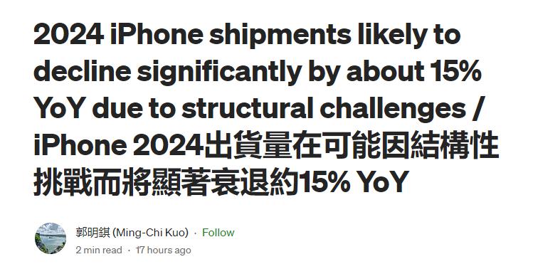就在市场等待通过苹果财报预判后市走向之时,长期关注苹果的分析师郭明錤给市场浇了一盆冷水。他在博客平台 Medium 上发布的最新供应链调查显示,苹果已经下调 2024 年 iPhone 的出货预估至 2 亿部,同比下滑 15%,在今年全球主要手机品牌中,苹果可能是衰退幅度最大者。