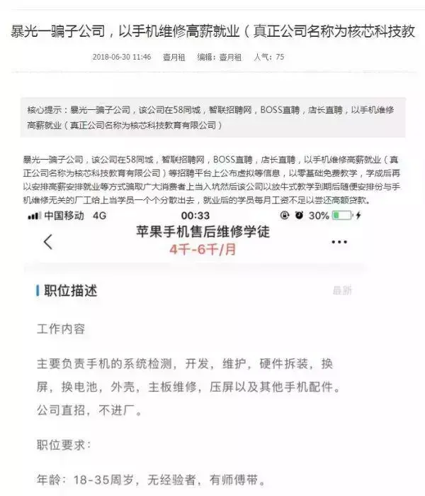 这些应聘者给有关部门发来的多张图片显示,这几家企业的招聘信息描述得非常诱人:“企业为京东售后维修基地,同时与苹果、三星、小米合作负责广东地区各大品牌手机售后维修与系统监测工作”、“维修中心直招,不进厂”、“转正后的工资6000至10000”,很多培训者在教育机构的推荐下,使用百度有钱花贷款交了这个名为“手机维修大师班”的学费。