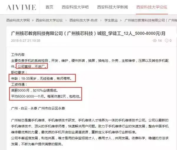 今年五月,广东的代先生在网上看到一则招聘信息,广州核芯教育科技有限公司零基础招聘手机维修学徒,月薪5000至8000,这让本来从事物业电工工作的他有些心动。