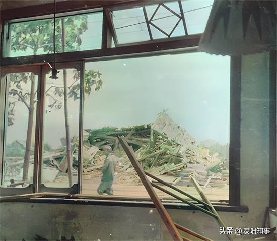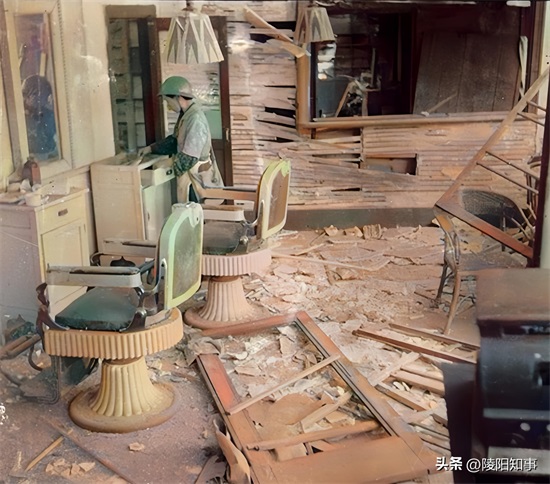离爆炸中心2.8公里处的绿町理发店,窗框被炸飞,建筑内部也遭受破坏。